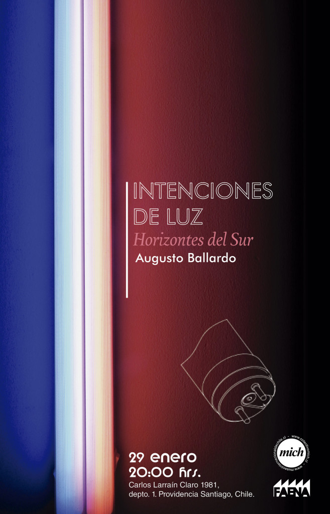Horizontes del Sur es la muestra que Augusto Ballardo realizó entre el 29 de enero y 6 de febrero de 2015 en la galería del colectivo Museo Internacional de Chile (MICH), conformada por instalaciones site specific donde el artista trabajó desde las posibilidades que el espacio le brindaba. Utilizando tubos fluorescentes de dos tonalidades y que en conjunto nos acercan al color arrebol del atardecer, nos invitó a recorrer su propuesta aproximándonos a estos Horizontes Intencionales.