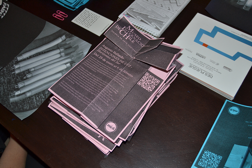 Fue imposible pasar por alto lo purista del montaje que asistía desde lo técnico al concepto de obra. Cercana a una estética minimal pero con fuerte arraigo en lo geométrico y abstracto, heredado de la iconografía precolombina estudiada en las culturas simultáneas Diaguita en Chile y Chancay en Perú. Esta construcción simbólica potente se podía corroborar en una gráfica lineal que representa los horizontes cordillerano y marítimo enlazados. Dicha figura repetida modularmente se encontraba en un dibujo enmarcado en acrílico y también al interior de la segunda sala, de manera menos perceptible, estaba pintada en sus paredes con un segundo blanco. Dos piezas de hule adosadas al muro con imanes prolongaban esta idea de horizonte continuo, ondeante, ambas pintadas con franjas paralelas de los colores de las luces; rojo y azul incandescente.
